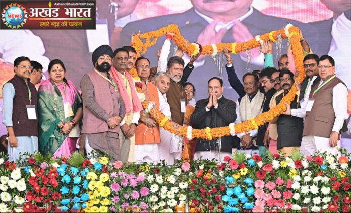 रायपुर (AkhandBharatHNKP.Com)। छत्तीसगढ़ सरकार के सफल दो वर्ष पूर्ण होने के उपलक्ष्य में जांजगीर- चांपा के खोखराभाठा पुलिस लाइन मैदान में आयोजित जनादेश परब में केन्द्रीय स्वास्थ्य एवं परिवार कल्याण मंत्री जगत प्रकाश नड्डा ने मंच से प्रदेश की उपलब्धियों, जनकल्याण और भविष्य की दिशा पर स्पष्ट संदेश दिया। वंदे मातरम और राज्यगीत के साथ आरंभ हुए कार्यक्रम में जनविश्वास, गौरव और निर्माण के संकल्प को दोहराया गया।